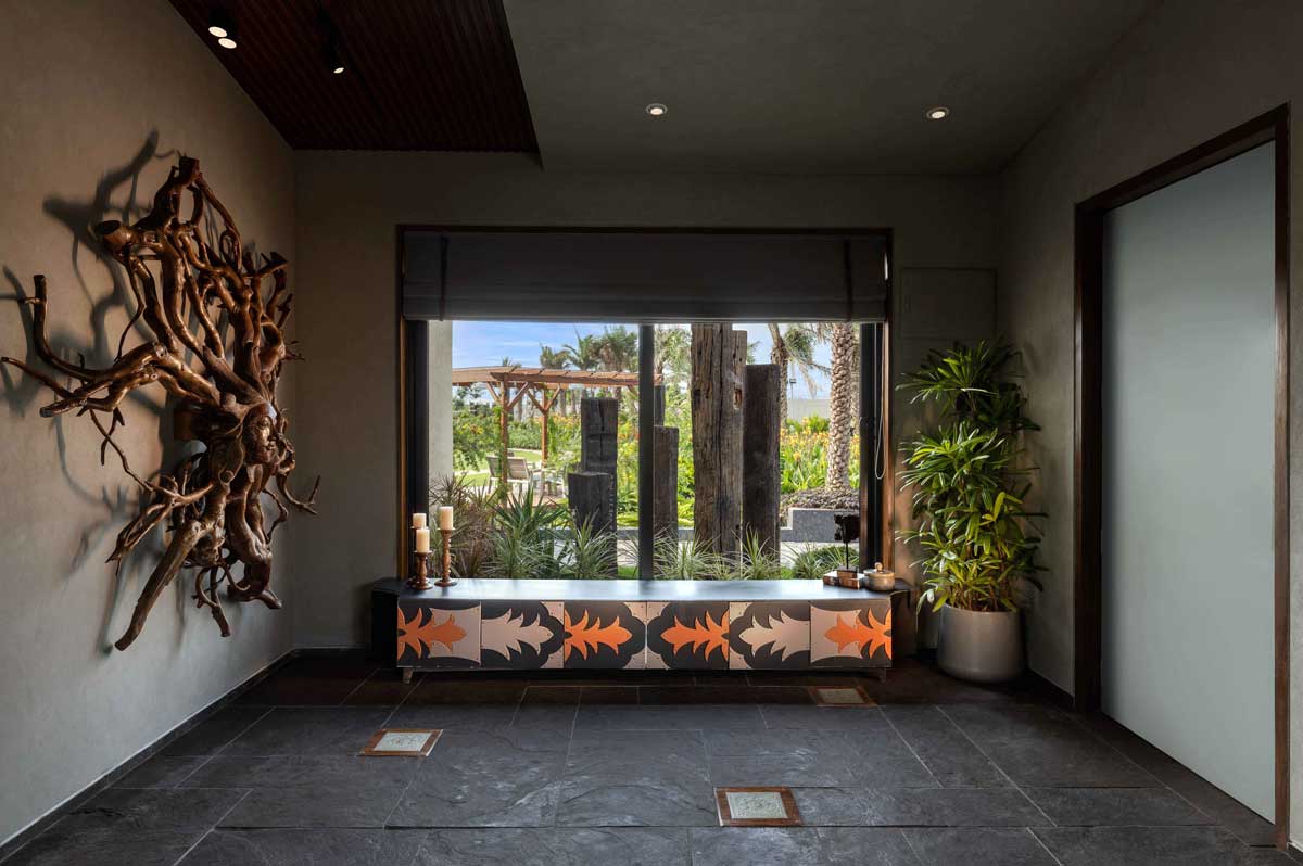 Raipur-based Azure Interiors is known for creating spaces that thrive on an emotional connection with the people who use them. The designer duo behind Azure, Rashi Bothra and Ruchi Gehani, presents an enchanting colour co-ordinated space. The designers rooted the aesthetics in nature while maintaining a sophisticated edge to create a relaxing atmosphere. The interior approach of this space is focused on keeping the common areas connected to offer flexible spatial configurations so that the rooms can operate independently or together to suit the occasion while being in sync with one another. The flooring in rough brown Kota stone accented with a highlighter with a pateena finish and interlaid with wooden tiles further sets a muted backdrop. The colour scheme acts as a highlighter element, which renders the space as a textured surface. The neutral atmosphere bristles with a raw edge. As a result, the eye is guided towards the verdant views framing the space. Supreme luxury embraces natural textures and materials to touch the senses gently enabling complete relaxation and rejuvenation of the body and the mind.